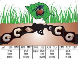 Even though you see many of the adults on the grass, they are usually mating and are harmless to the turf at this time. The adults are harmful to certain flowering shrubs and trees over the next few weeks. The grub stage is harmful to the turf. The larvae, especially the young larvae eat like teenage boys. When we see approximately 10 grubs per square foot we know it is time to treat because the turf will struggle with severed roots.